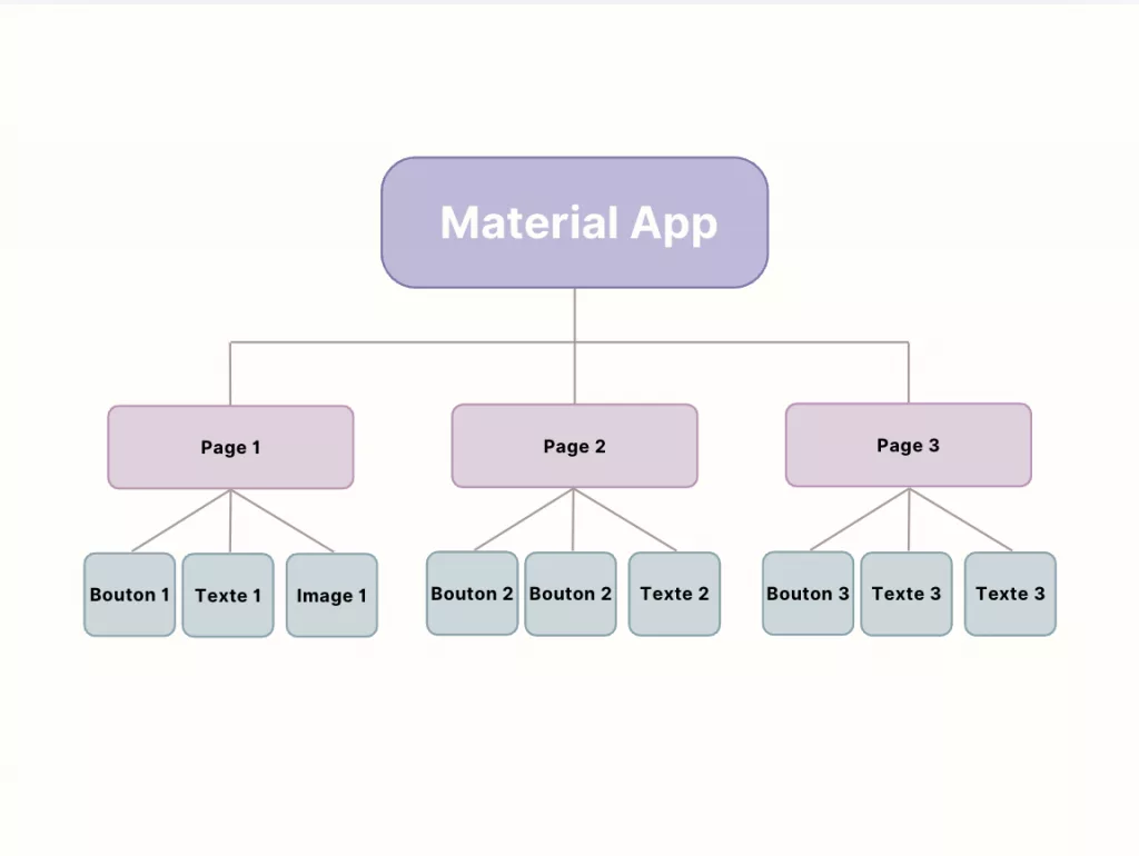 Quand vous lancez votre application sur un téléphone, votre code est lu en commençant par le début de votre « arbre de widgets ». Il construit d’abord la Material App (une sorte de page blanche), puis ajoute les objets qui sont dedans, et les objets à l’intérieur de ces objets, jusqu’à obtenir le rendu final de votre application. Par exemple, voici à quoi pourrait ressembler un arbre de widgets simple :